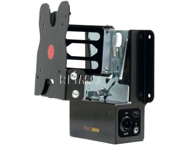 TV-seinäkiinnike, irrotettava - TV-pidike 12 V: llä ja TV-antenniliittimellä. Jatkettava 227 mm: iin. Turvalukko (estäminen ajon aikana). Päänosa käännettävissä + kallistettava 10 °: seen saakka. Kantolaite (pysyy kiinnitettynä TFT: hen) otetaan irrotettavalla salvalla seinälevyltä (pysyy seinällä). Televisio voidaan muuntaa ulkoilmaksi tai toisella seinälevyllä (valinnainen). Pistorasia on varustettu 12 V-liittimellä ja TV-liittimellä. Joustava jopa 8 kg asti.